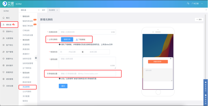 1、 新增:奖品管理新增兑换码、实体礼品类型,可结合裂变活动奖品使用