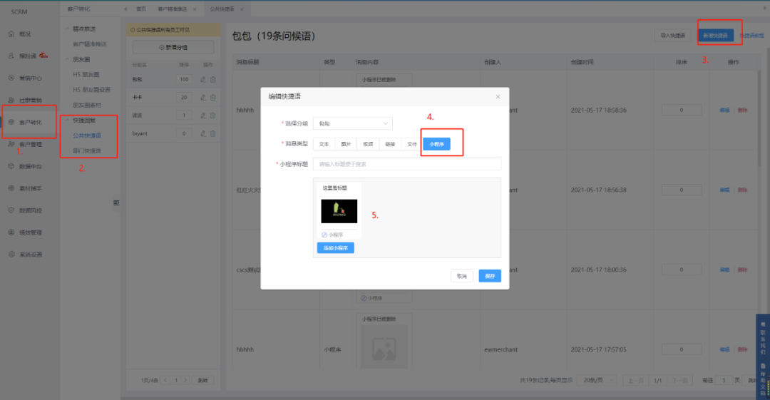5、 新增:快捷回复新增小程序类型