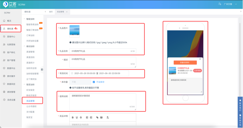 页面路径:爆粉通-裂变加粉-奖品管理