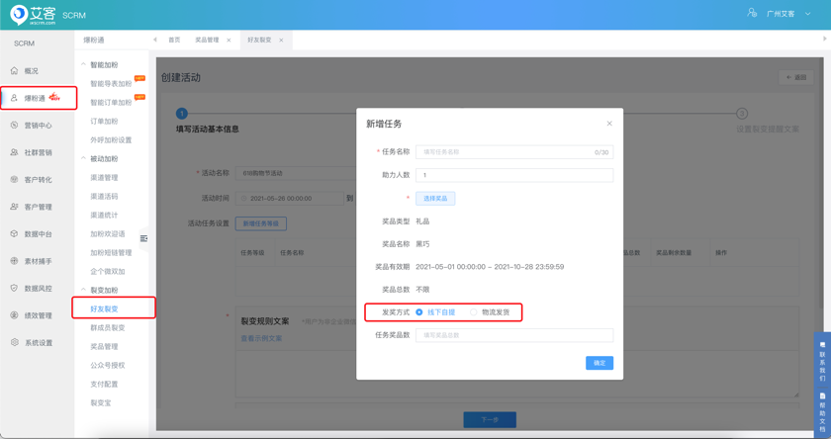 3、新增:裂变活动选择礼品后,设置发奖方式(线下自提/物流发货)