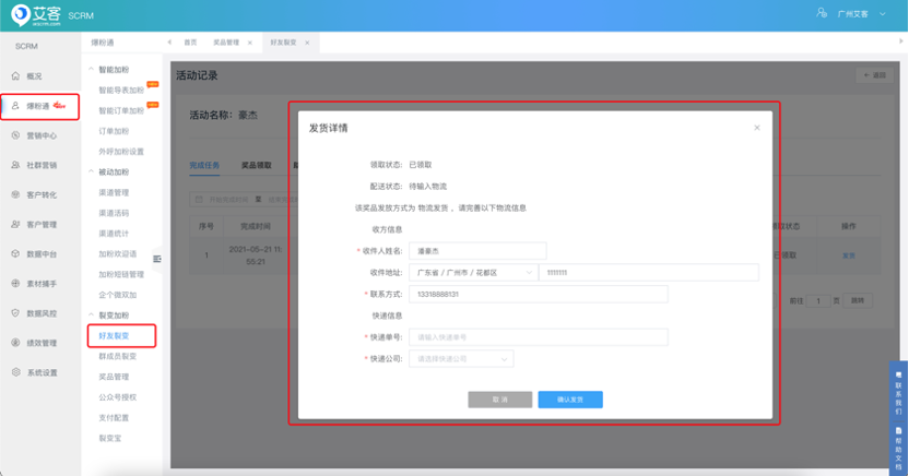 对设置活动中需【物流发货】的礼品奖品进行发奖操作,同步用户收件信息,录入快递单号及公司信息