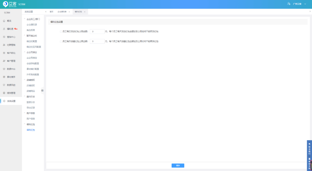 员工在客服端侧边栏使用红包功能时,可在系统中社会员工创建红包上限和发送红包上限。当达到上限后,员工将不能创建/发出红包。