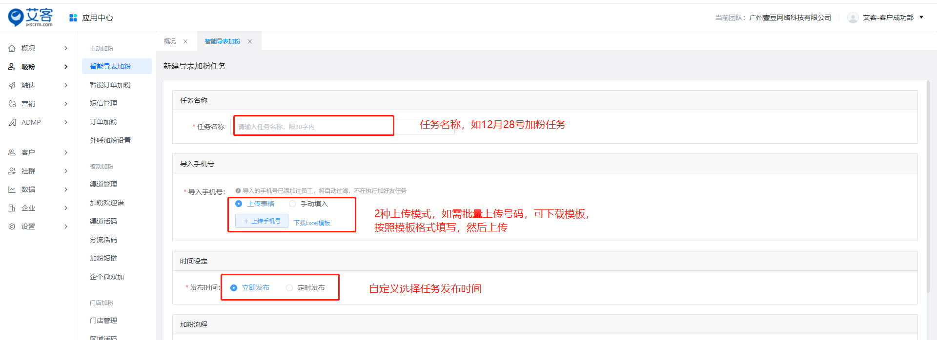 按照系统后台步骤,先在智能导表加粉功能里新建一个加粉任务,之后下载模板,根据模版上传需要添加好友的手机号;或者自己手动填入手机号,设定整个加粉任务的开始时间,可以设置好后立即发布,或者是定时发布。