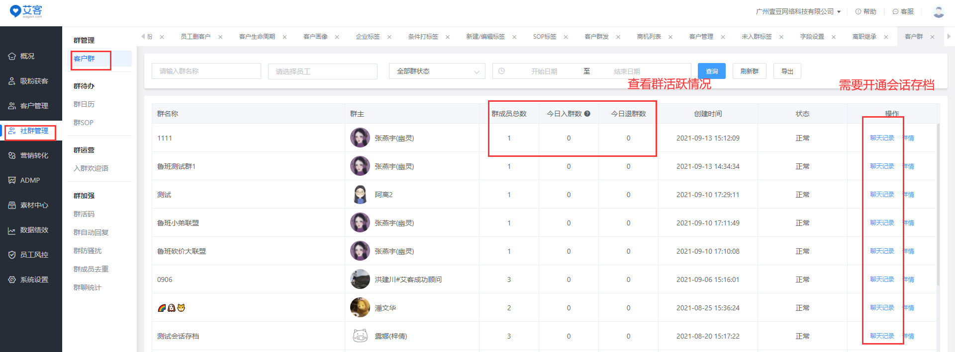富联注册在社群管理方面,有比较完善的客户群管理功能。那就是企业员工创建的外部群,集成在富联注册管理端统一管理。管理员可以筛选查询每一个员工有哪些群,并可以查看到这些群的人数、群主、以及具体的群成员组成。此项功能不仅方便企业对员工的管理,也方便企业查看社群运营情况。