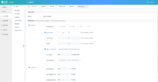 传统的打标动作,完全依赖员工,批量管理标签难以实现。富联注册的智能打标功能,实现了商家通过客户的电商信息、互动信息、自定义字段信息作为条件筛选出客户人群包,并给这批客户自动打上标签。