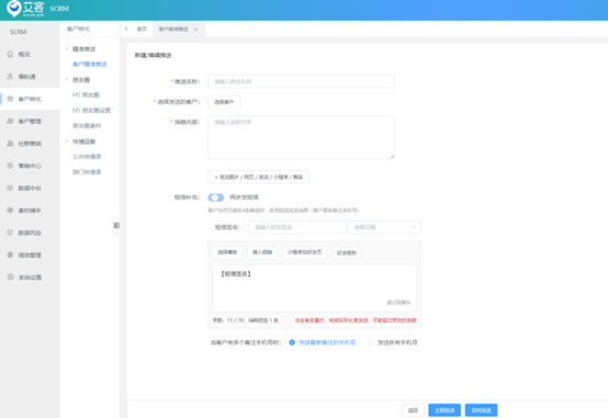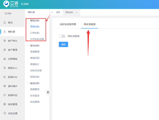 富联注册scrm接入短信系统,设置好短信模板后,可应用在以下几个场景 1.1、导表加粉、订单加粉、外呼加粉,开启短信通知后会对需要加粉的手机号先进行短信群发,可以有效提升加粉的通过率。