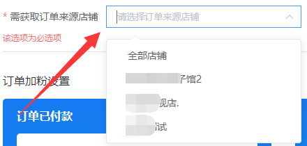 b、选择需要加粉的电商店铺,这些店铺有新订单时,会自动获取新订单的手机号,这个手机号会根据设置的任务自动执行加好友注:如果导入的手机号在系统中已存在,将自动过滤不在添加