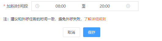 注:当有开启AI外呼的时候,加粉时间要在AI外呼时间段之内,这是为了避免导入大量手机号,但没有到外呼时间,导致外呼失败。建议加粉时间和外呼时间保持一致,避免任务失败。
