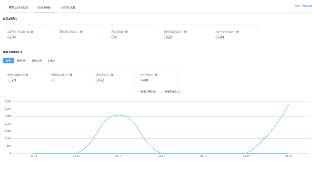 - AI外呼+发短信+分配员工加粉:是指有新的订单收货手机号时,会导入手机号进行AI智能外呼,用户接电话并确定有加好友意向时,接着会给有意向的手机号发送商家指定的短信内容,通过双重触达后再分配给选中的员工,员工会收到实时提醒,要求员工实时去添加当前这个手机号为好友.