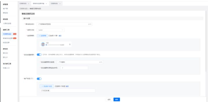 在“无限群活码”内可以设置群活码的名称、分组、群聊、自动创建新群群名规则、客户标签等内容,点击保存后,即可创建完成。